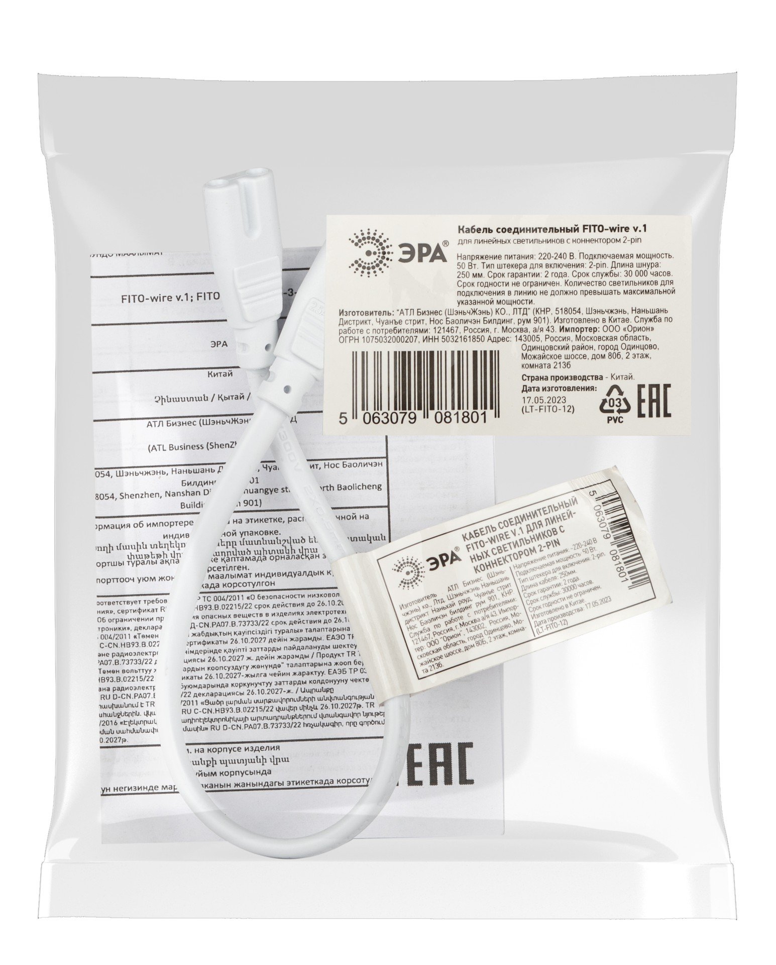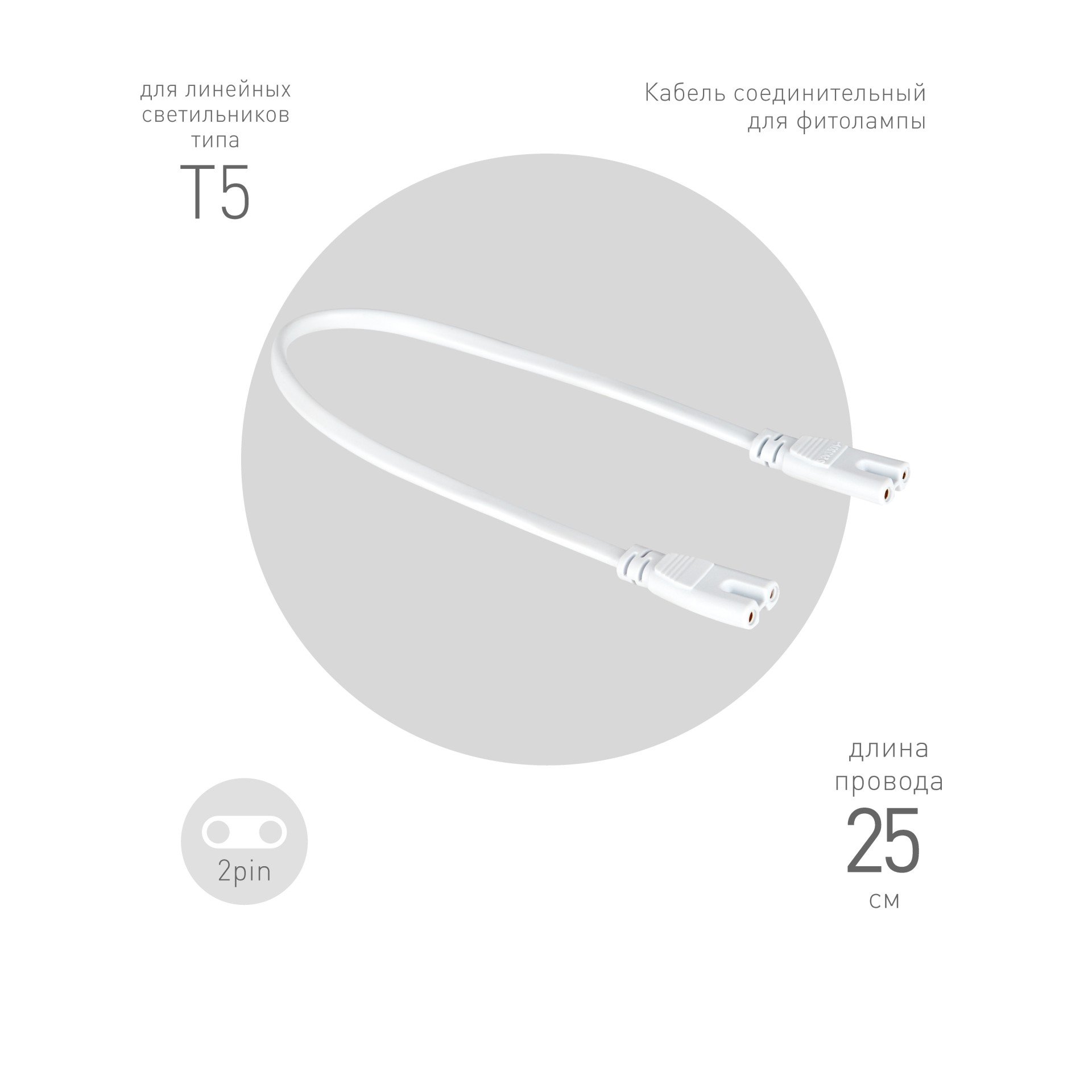ЭРА FITO-wire v.1 - соединительный провод для подключения нескольких светильников с коннектором 2-pin в единую цепь. Длина - 25 см. Двужильный кабель ПВС 2х05 мм2. Двойной штекер на двойной штекер.