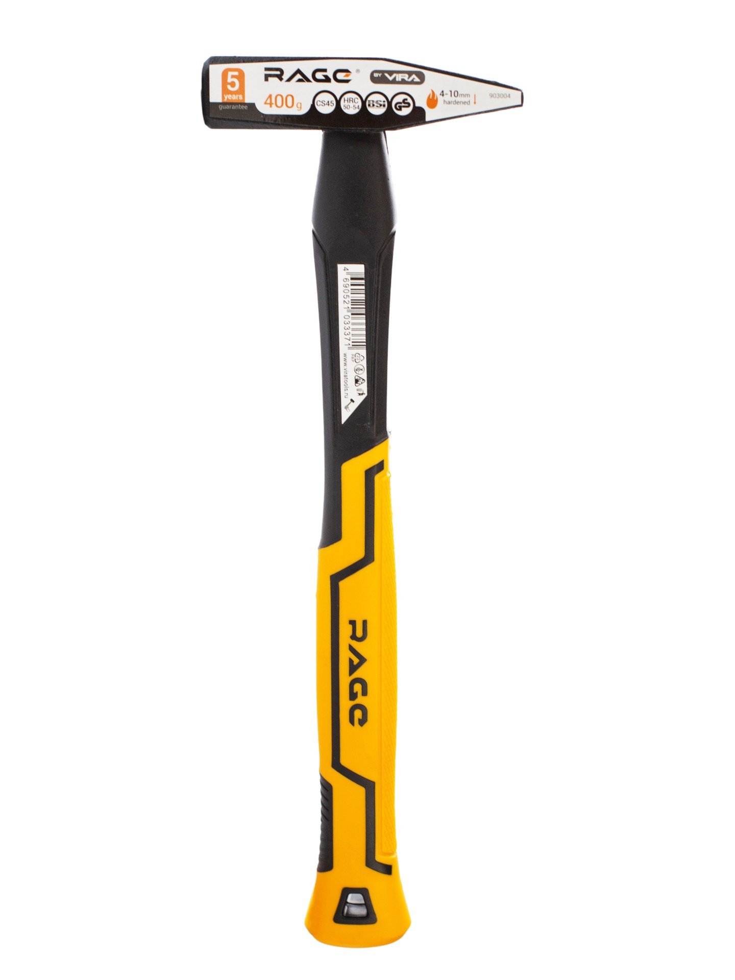 Молоток слесарный 400 г VIRA RAGE: Применяются для для забивания крупных и мелких гвоздей, для сборки и демонтажа конструкций из дерева, обработки металлов; Длина молотка: 365 мм; Вес бойка: 400 г; Общий вес: 600 г; Твердость бойка: 50-54HRC; Материал: сталь CS45; Рукоятка: стержень-фибергласс; Покрытие: TPR и ABS; Соответствует стандартам DIN.