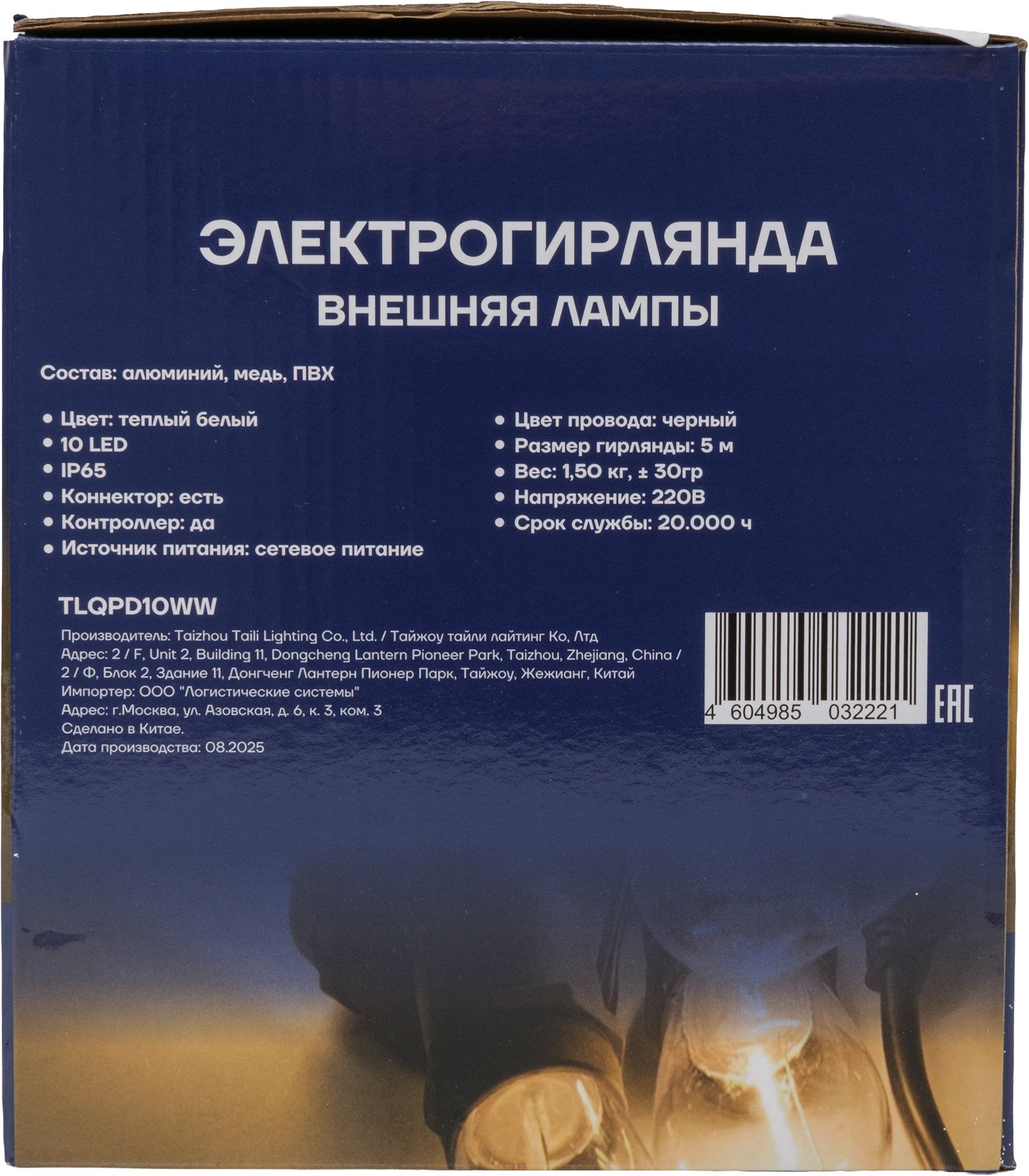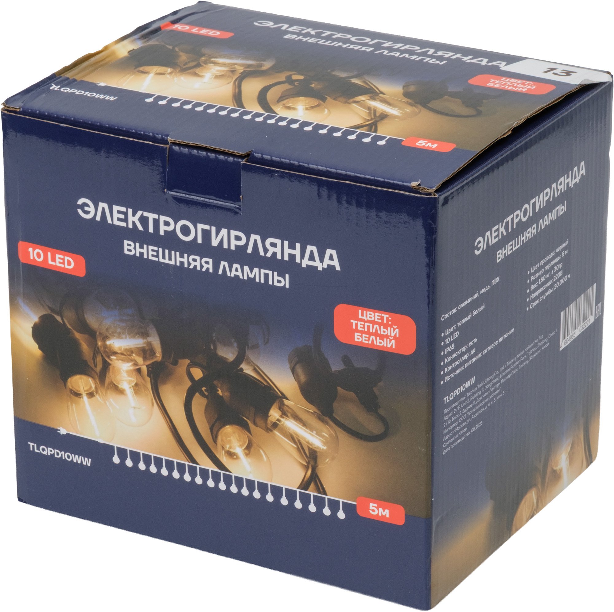 - Электрогирлянда внешняя Лампы 5м 10LED IP65, теплый белый, контролер, с коннектором, черный кабель