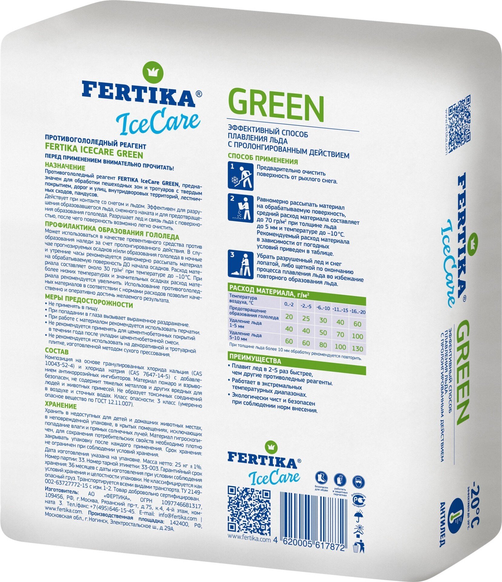 Противогололедный материал FERTIKA IceCare GREEN предназначен для длительного предотвращения образования наледи за счет пролонгированного действия. Работает при температуре до -20°С. Идеален для превентивной обработки пешеходных зон и тротуаров с твердым покрытием, дорог и улиц, внутридворовых территорий, лестничных сходов, пандусов.Действует при контакте со снегом и льдом. Эффективен для разрушения образовавшегося льда, снежного наката и для предотвращения образования гололеда. Разрушает лед и связь льда с поверхностью, после чего поверхность возможно легко очистить. Состоит из смесевой композиции гранул хлористого кальция 15% и хлористого натрия 80% с антикоррозионными добавками 5%