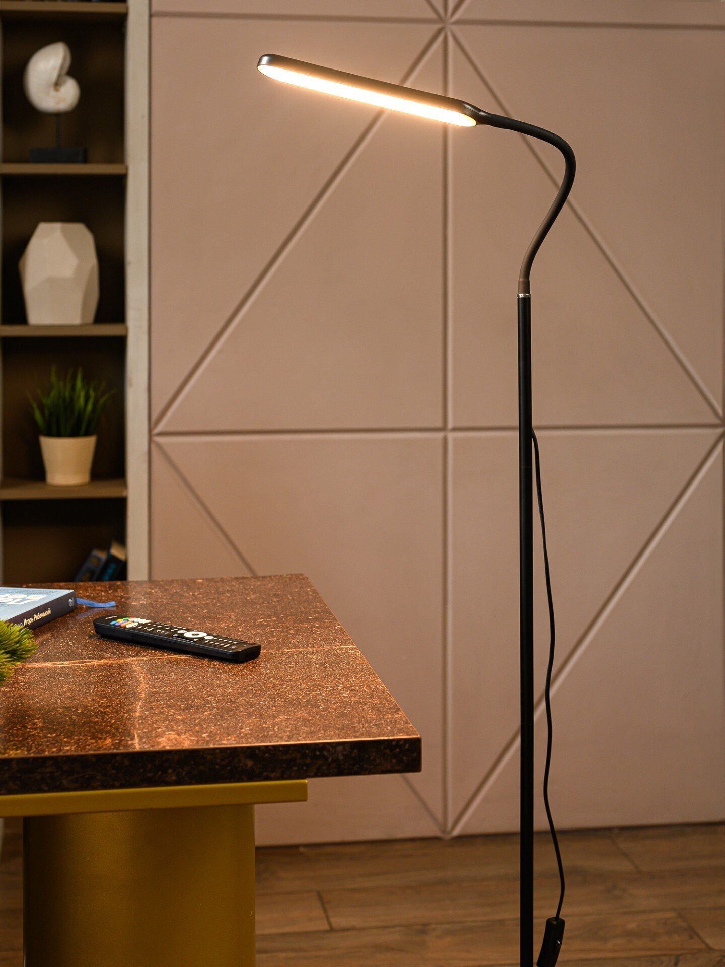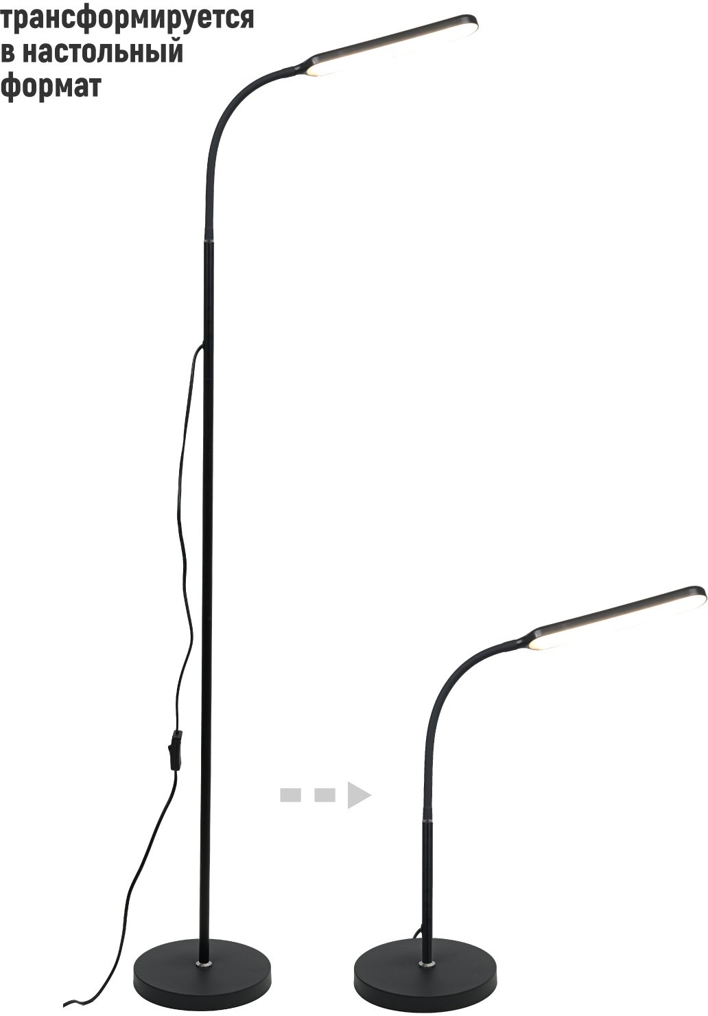 Напольный светильник (торшер) ARTSTYLE TL-518B — чёрная модель высотой 1770 мм с LED-подсветкой, регулировкой наклона плафона и температуры освещения (тёплый, нейтральный, холодный). Оснащён диммером, работает от сети (10 Вт), имеет световой поток 600 лм, длину провода 1,8 м. Каркас из металла и пластика, плафон — пластик, в комплекте есть лампочка. Подходит для дома или офиса.