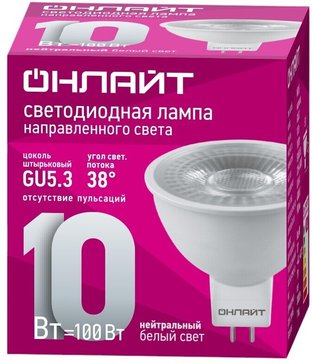 Светодиодная лампа Onlight «Призма» мощностью 10 Вт с цоколем G5.3 обеспечивает яркое и комфортное освещение с цветовой температурой 4000 К — нейтральным белым светом, идеально подходящим для кухонь, рабочих зон, офисов и торговых пространств.