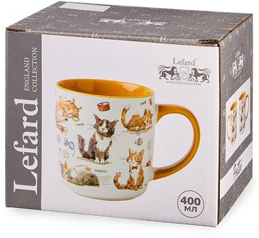 Кружка TM Lefard с очаровательным дизайном имеет удобную ручку и отличный объем 400 мл. Кружка изготовлена из качественного фарфора. Отличный выбор для подарка. Продукция сертифицирована и безопасна для контакта с пищевыми продуктами. Можно ставить в микроволновую печь.