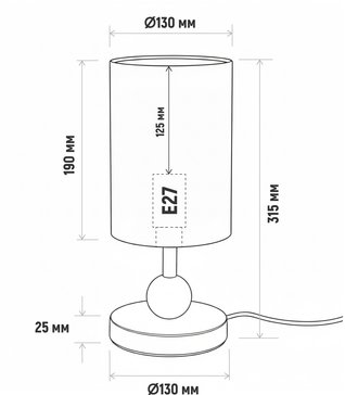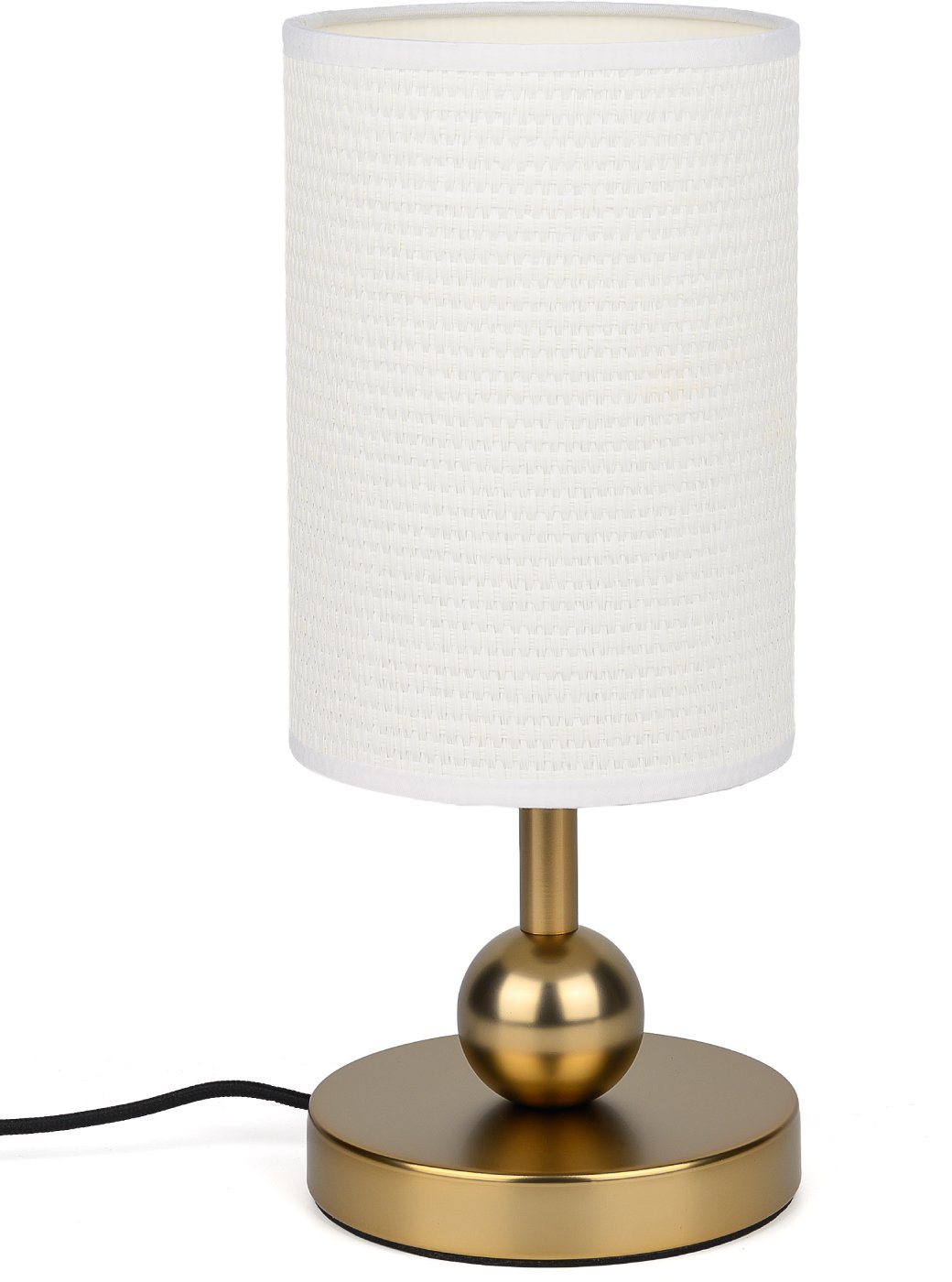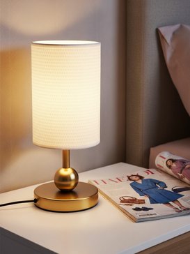 стильный золотистый металлический корпус; цилиндрический тканевый плафон;